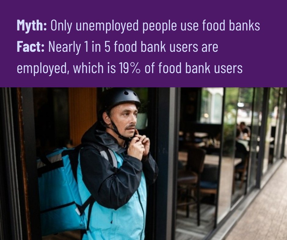 Myth: People who use the food bank are unemployed. Fact: Many food bank clients are working—often juggling multiple jobs—yet still struggle due to rising housing, grocery, and utility costs. A recent study shows that the main earner in two thirds of all households experiencing food insecurity held a permanent, full-time job. Food insecurity can affect anyone. |