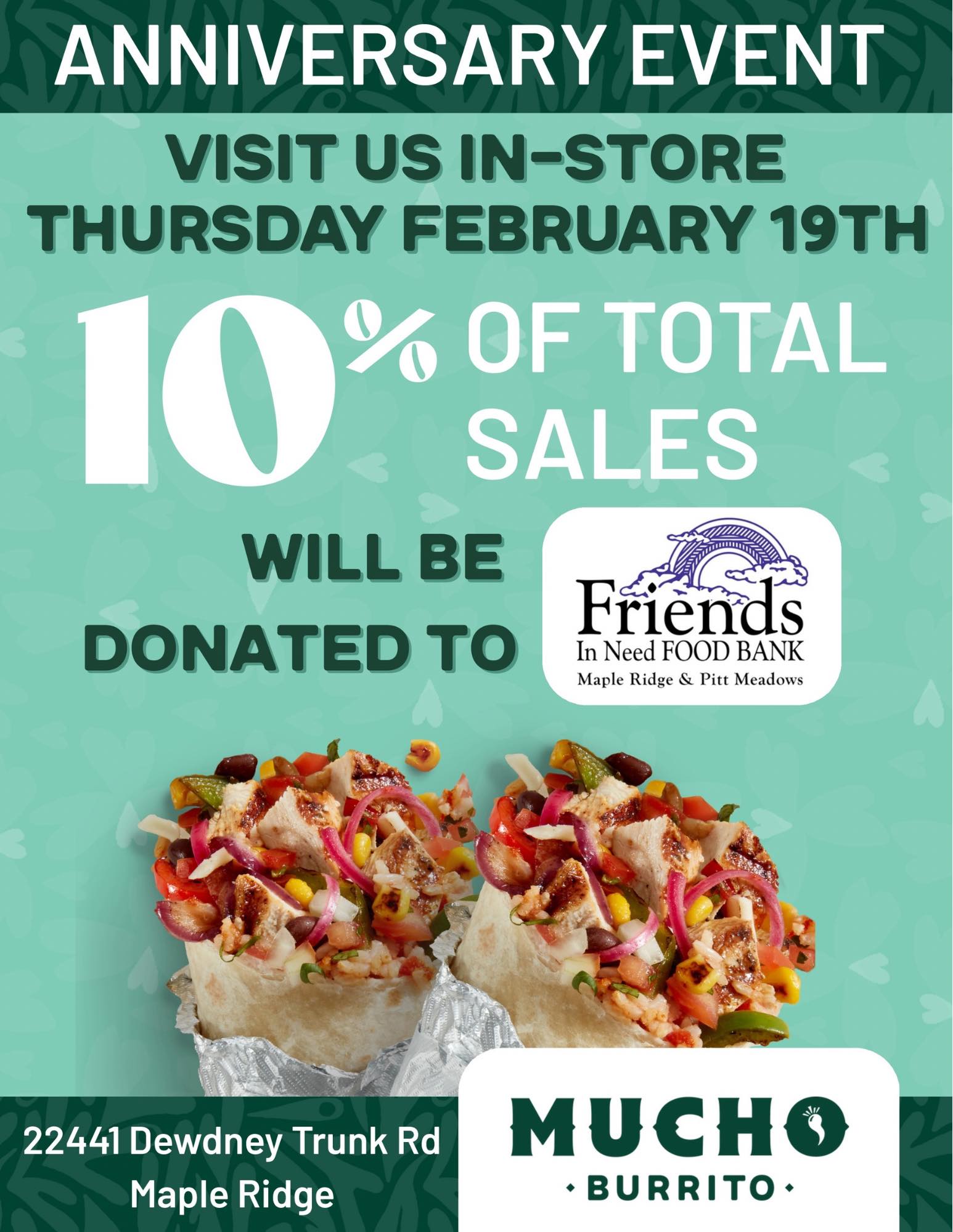 Mucho Burrito Maple Ridge is celebrating their one year anniversary by giving back On Thursday, February 19th, Mucho Burrito Maple Ridge will be donating 10% of total sales to Friends in Need Food Bank to help support local families experiencing food insecurity. Enjoy your favourite flavours while supporting a great cause 22441 Dewdney Trunk Rd, Maple Ridge |