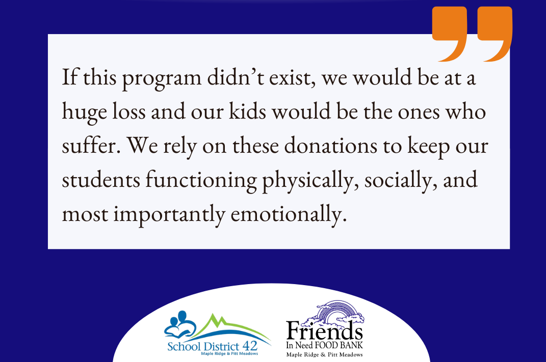 Here are a few words shared by staff from SD42 secondary schools participating in our School Meal and Snack Program, which provides food to support more than 2,000 students each week. This program is made possible thanks to the generosity of our community.